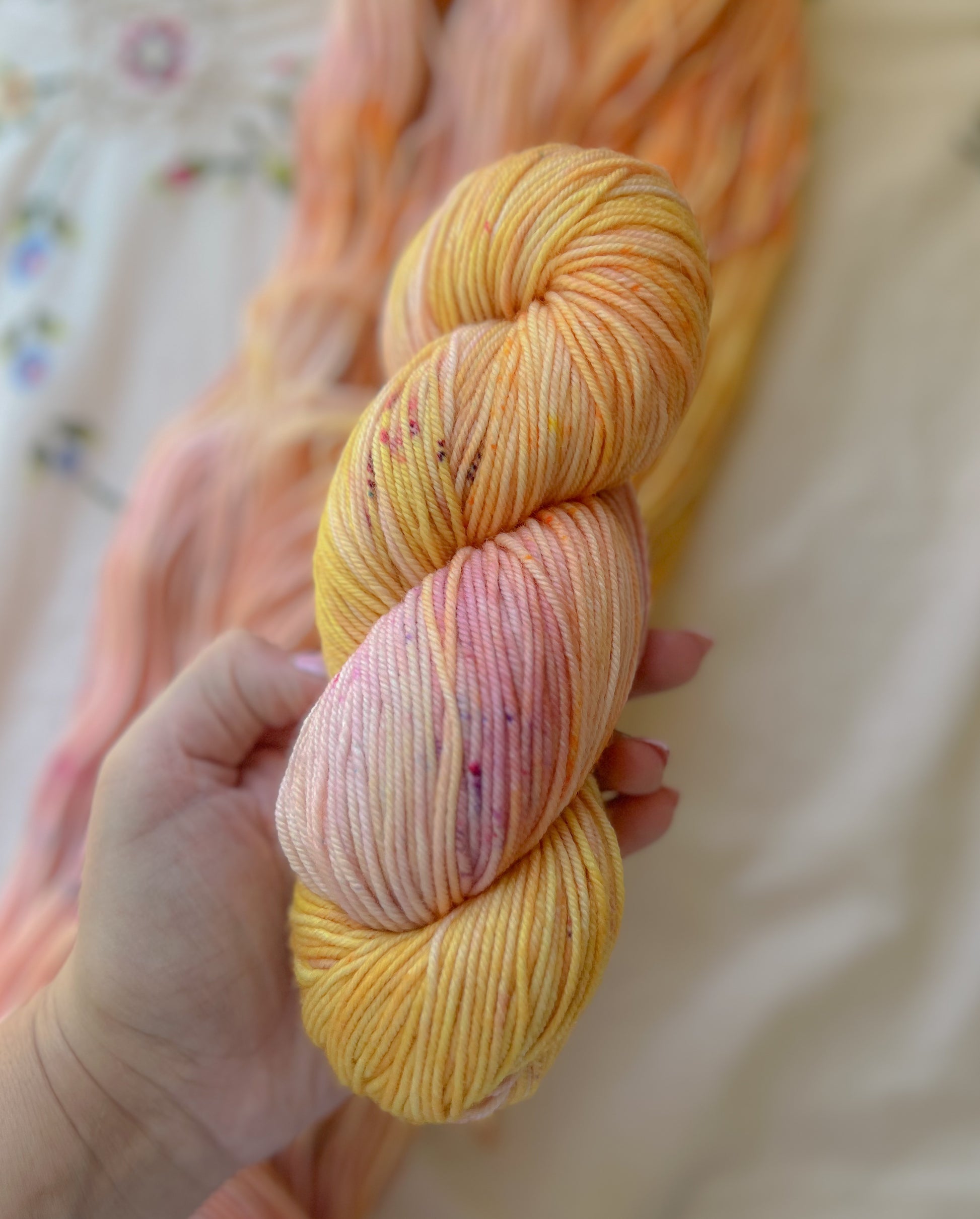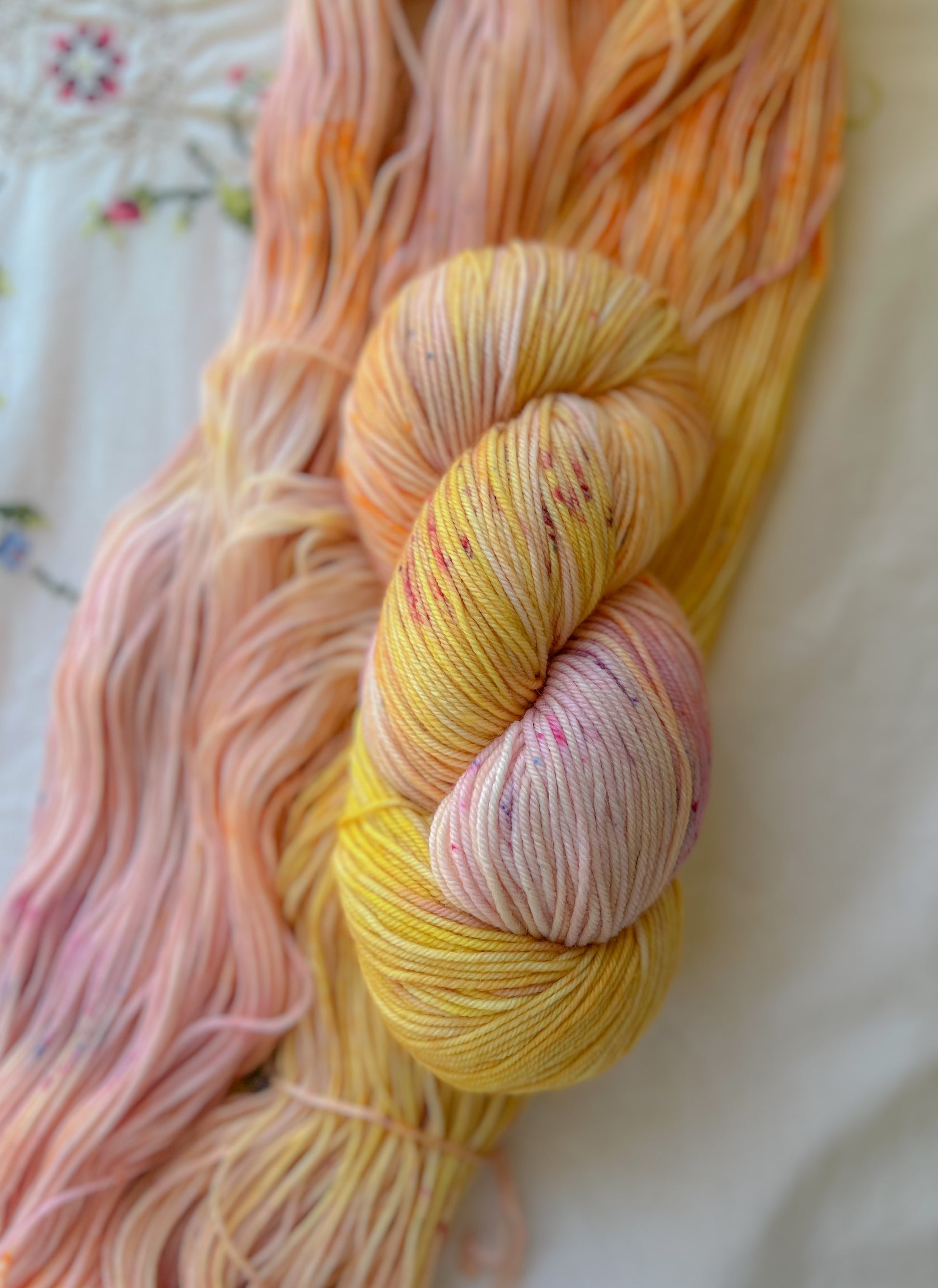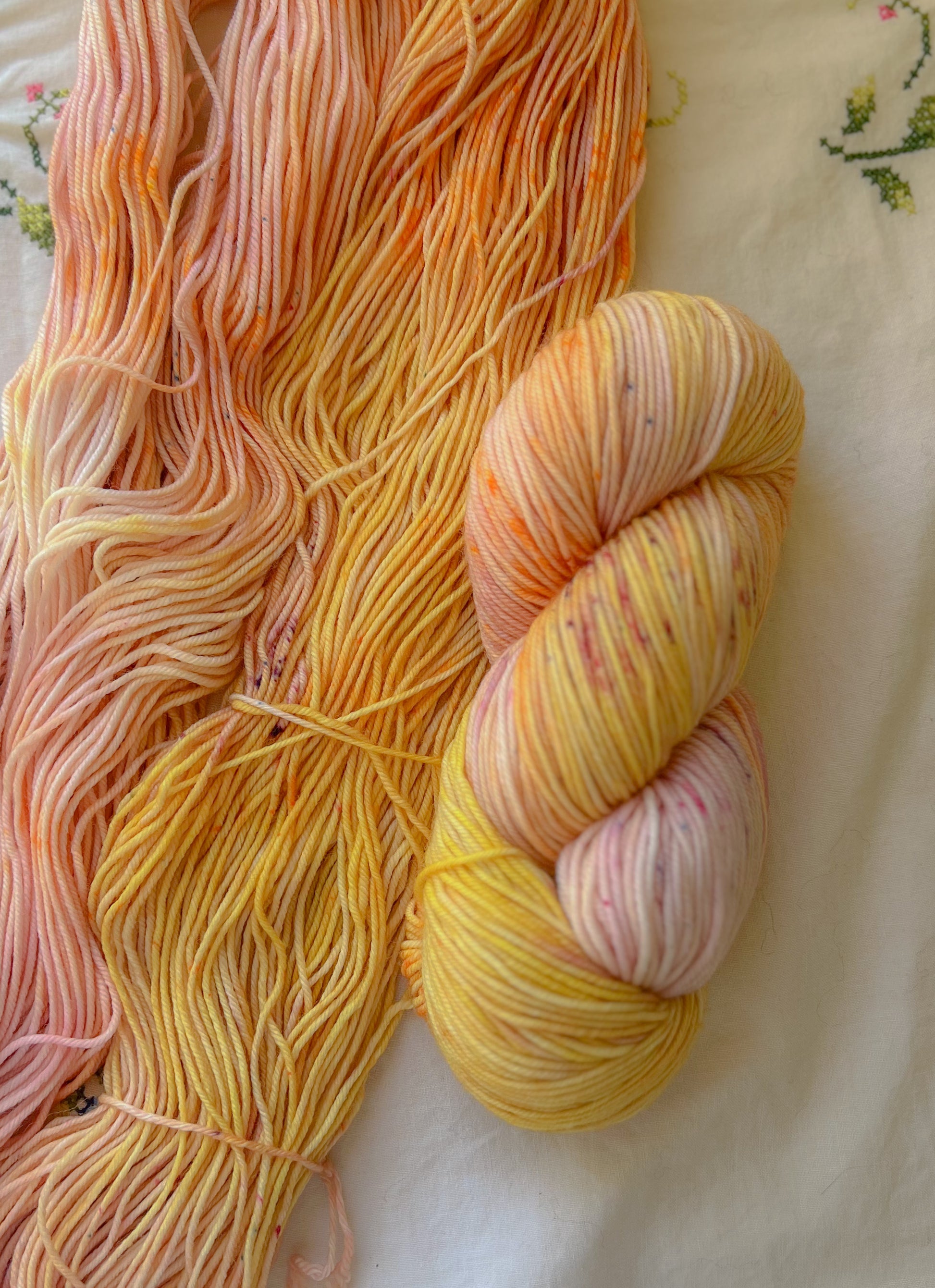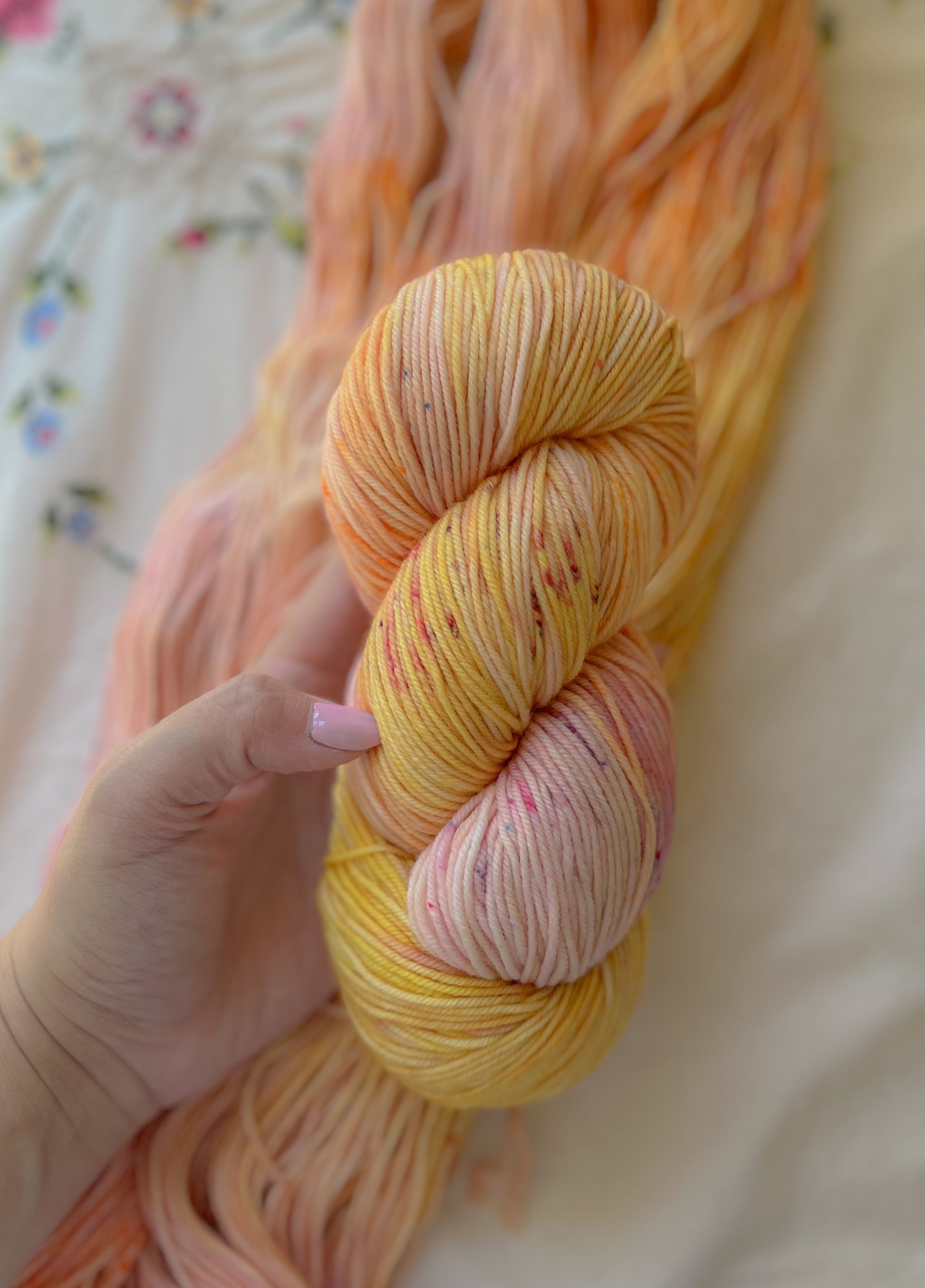 Hebe — the Greek goddess of youth and vitality, forever serving up energy and refreshment to the gods. This yarn channels her sunny, uplifting spirit with a marbled mix of yellow, orange, and pink, dotted with playful speckles of orange and pink that feel like little bursts of joy. Knits into a bright, cheerful fabric that radiates optimism and life—perfect for projects that need a little goddess-level sunshine.