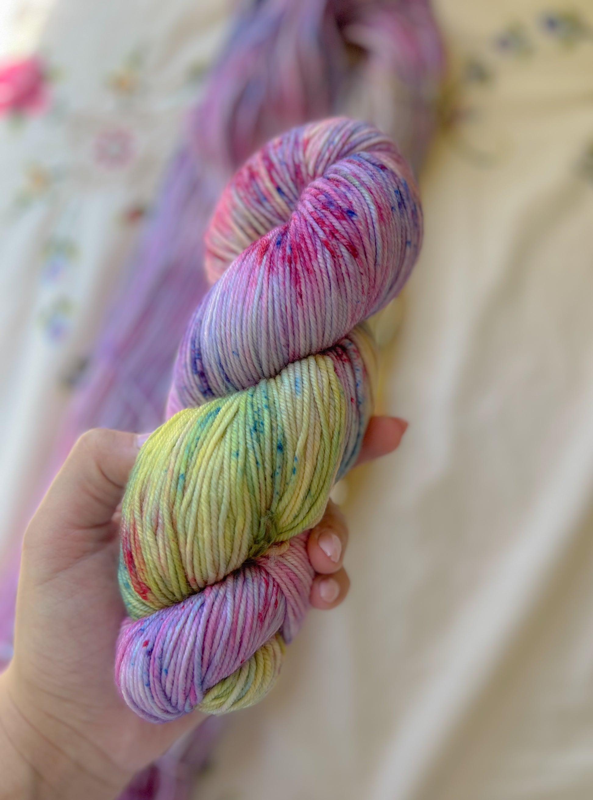 Hestia — the goddess of hearth and home got a yarn makeover. A riot of color, mostly serene blues and soft pinks, but sprinkled with pops of other cheerful shades like she decided to invite the whole pantheon to her knitting circle. Knits into a vibrant, warm, and cozy fabric that feels like a hug from a Greek goddess herself—majestic, magical, and just a little bit show-offy.