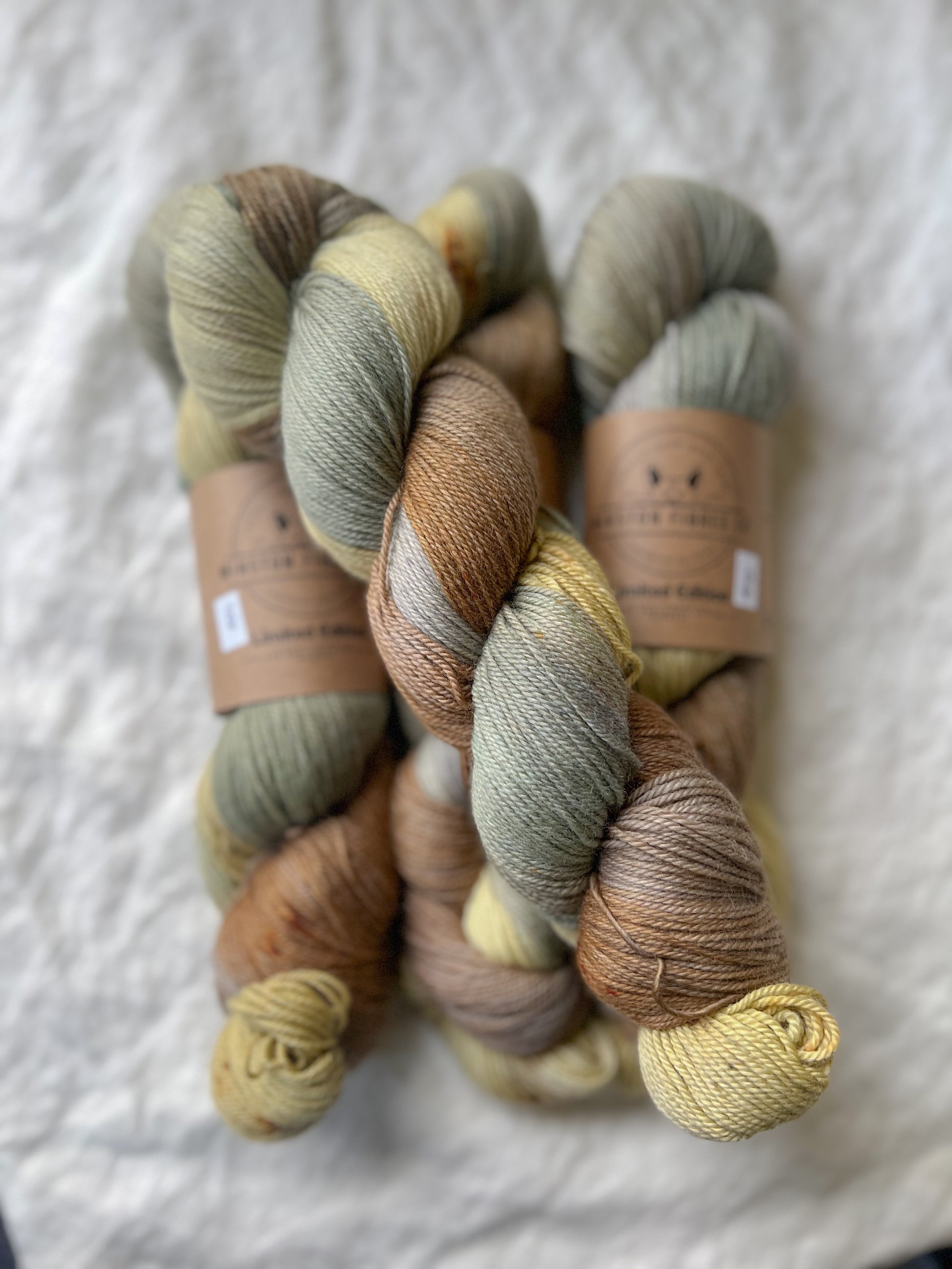 LOT 12 includes: 4 skeins (Limited Edition base, 3 ply/ fingering, colourway: forest floor )
