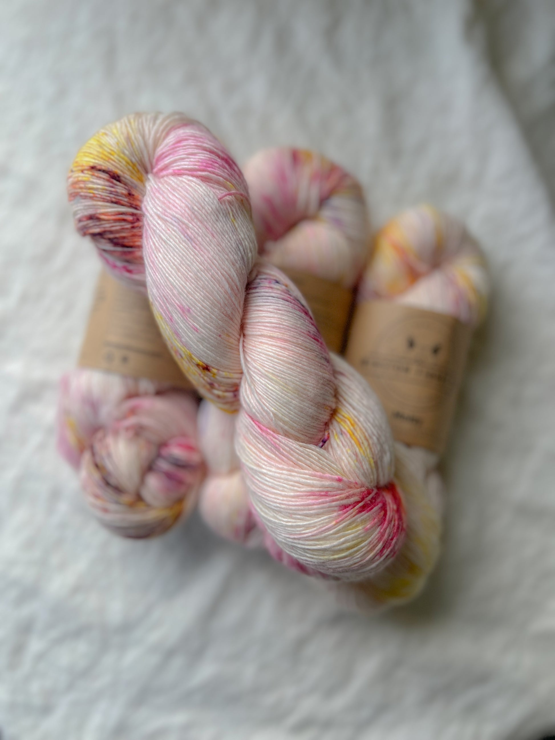 LOT 4 includes: 4 skeins (Maisy base, single ply/ fingering colourway: Spring Peony)