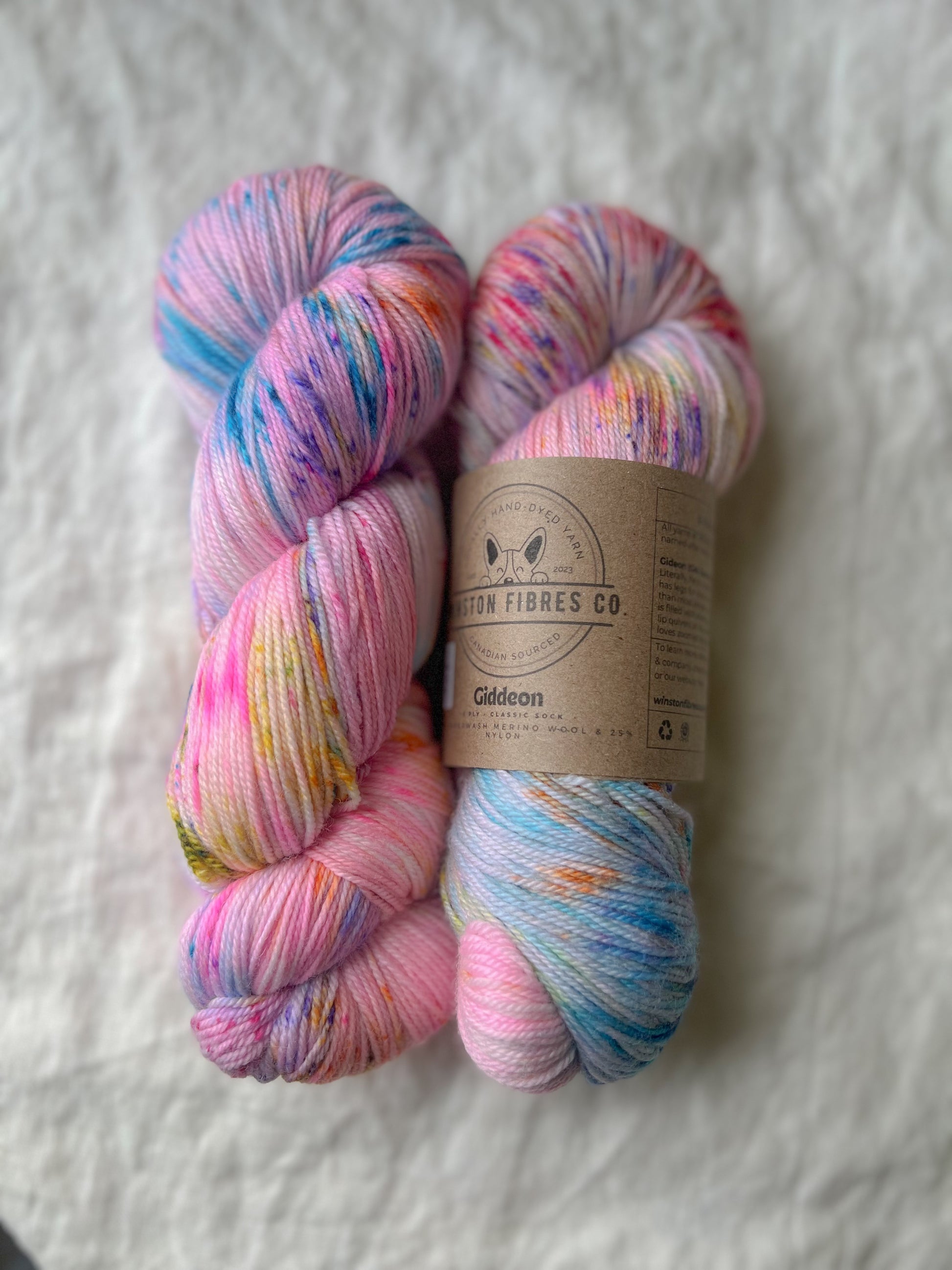 LOT 7 includes: 2 skeins (Giddeon base, 3 ply/fingering, colourway: Funfetti)